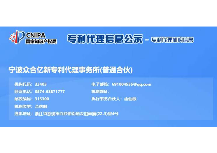 浙江億新知識產(chǎn)權(quán)服務(wù)有限公司前身為慈溪眾合知識產(chǎn)權(quán)代理事務(wù)所,創(chuàng)始于2004年,為了服務(wù)更多的創(chuàng)新企業(yè),實現(xiàn)“服務(wù)億萬創(chuàng)新企業(yè)”的理念,后更名為浙江億新知識產(chǎn)權(quán),旗下公司包括:寧波眾合億新專利代理事務(wù)所(機構(gòu)代碼33405)、中范(北京)認證有限公司。其中寧波眾合億新專利代理事務(wù)所是慈溪市科技服務(wù)聯(lián)盟理事單位,前灣區(qū)知識產(chǎn)權(quán)工作站。公司位于浙江省慈溪市文化商務(wù)區(qū)友誼商廈,并在北京、青島設(shè)有辦事處。